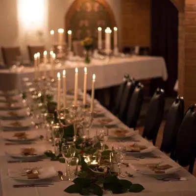 Matsalen tar sällskap upp till 70 personer. För större sällskap, upp till 120 personer, dukar vi upp både i matsalen och salongen. För en mingelbuffé har vi plats för 150 personer.